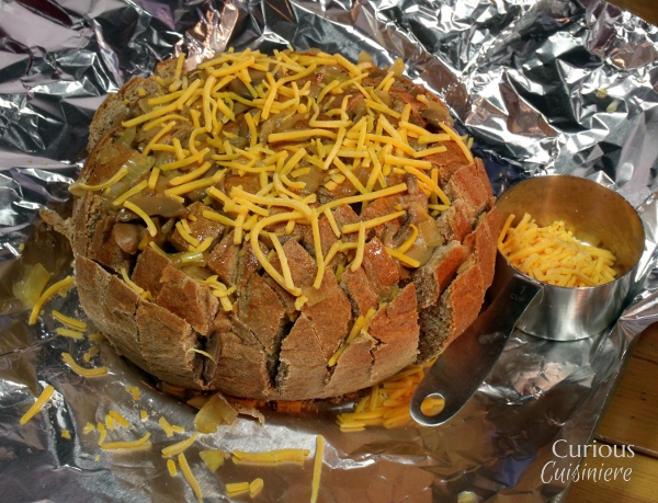将奶酪填充到狭缝中。伴随着洋葱和蘑菇混合物。安排任何不适合在面包顶部的洋葱。撒上奶酪到顶部。