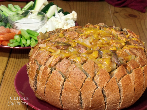 这个派对将搭配面包塞满了粘糊糊的切达干酪和啤酒焦糖洋葱和蘑菇的边缘。准备好挖掘!