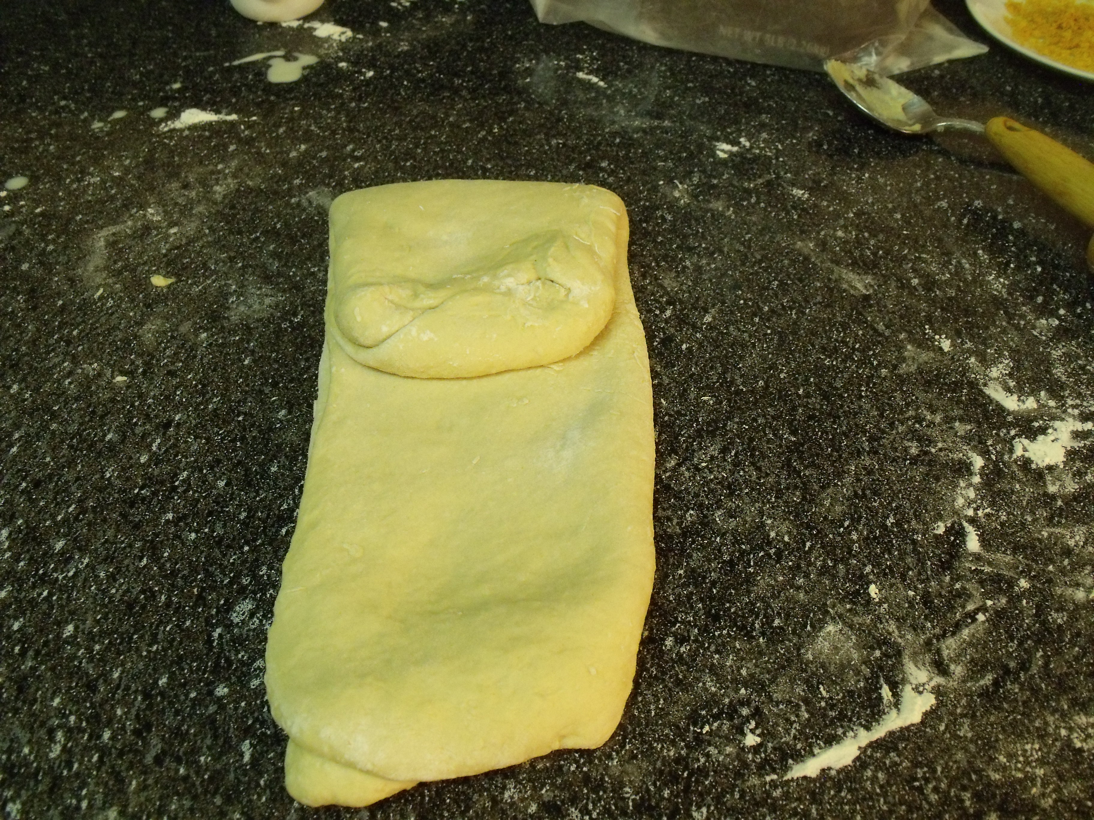 6.把面团转¼圈。把上面的三分之一折叠在中间的三分之一上,把下面的三分之一折叠在中间的三分之一上。轻轻滚动了。