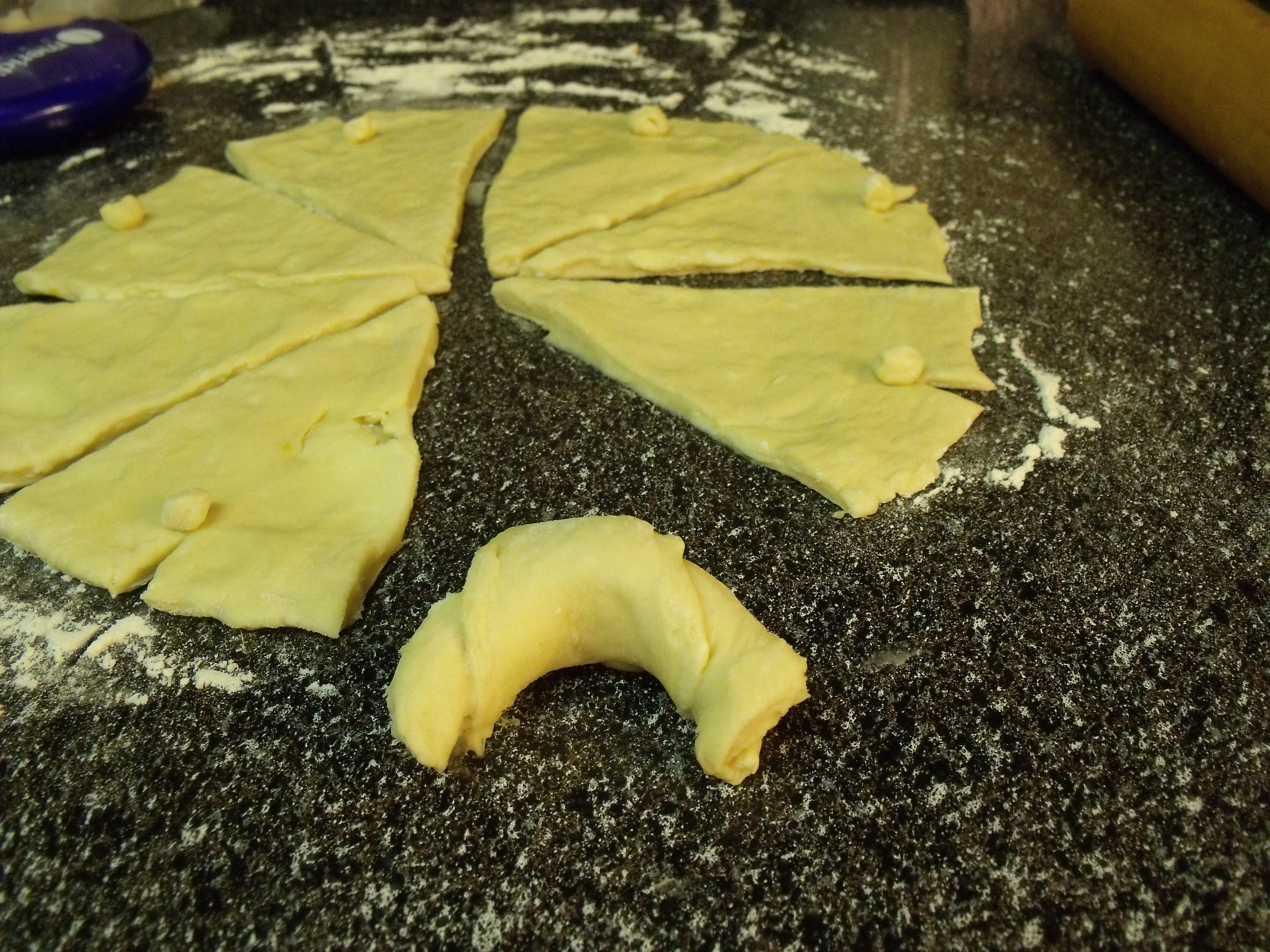 这是一种非常有趣的制作三角形的方法(并使它们都相同大小)。你的羊角面包看起来很漂亮。