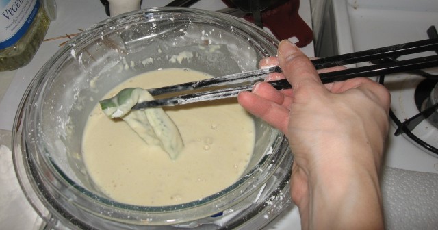 3.从蔬菜开始,比如红薯,它不会在油里留下强烈的气味。把它们浸在浅碗里,轻轻裹上一层面粉,然后浸入面糊中。将它们放入热油中,每次只炸几片,这样油的温度就不会下降。