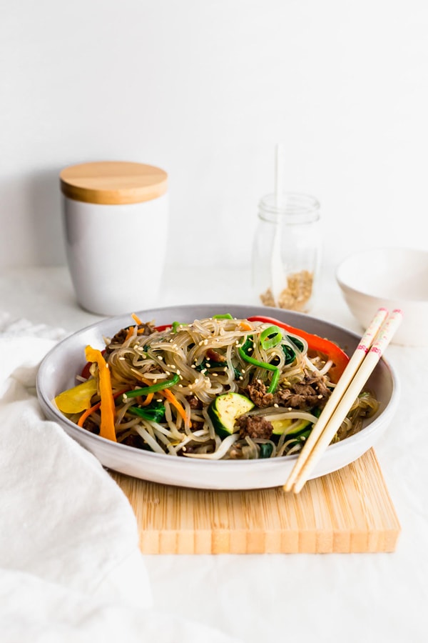 吃剩的japchae可以储存在冰箱里——面条在冰箱里会变得有点硬,但在微波炉里很容易重新加热。它们会恢复柔软耐嚼的状态。