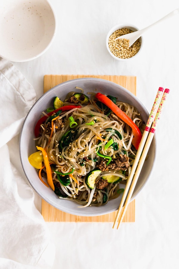 在japchae中,甘薯粉面条变得有嚼劲,好吃,很容易吸收与各种蔬菜混合的甜咸酱汁。