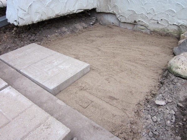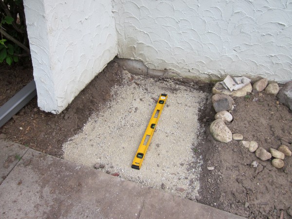 我们留出的地方原来是花坛的一部分。所以,首先,我们得挖出一些泥土。我们往下挖了大约4英寸。看起来很多,但如果我们要建一个大露台,会更多。但是,由于这一小部分不会被走过或打扰太多,我们决定走得更浅一点。该洞必须考虑排水砾石,平整沙子和摊铺者。