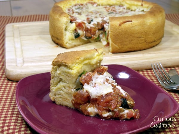 比萨的特点是近3英寸地壳周围的边缘,这是必要的包含所有的奶酪,浇头,以及厚实的番茄酱,填补内部。G.ydF4y2Ba